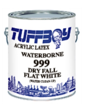 Tuff-Boy 999 Line of water-Based Dry Fall Flats are high hiding coatings formulated for interior application via conventional or airless spray equipment only. This coating will not yellow, is low VOC*, and has no harmful solvent odor which will allow one to spray in areas while people are still working. Tuff-Boy 999 White will reduce lighting requirements and is ideal for commercial and industrial areas where dry overspray characteristics are desired. Overspray from the Tuff-Boy 999 Line does not stick, but falls to the floor as a dry dust which may be swept up without damaging the surfaces on which it has fallen. . Because Tuff-Boy 999 is a water-based dry fall coating, a large amount of moisture is released into the atmosphere during application. Proper ventilation is required to ensure that humidity levels do not increase to the point that dry fall no longer occurs.