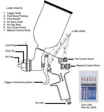 1. The spray gun should be lubricated after every cleaning using SHARPE gun lube. Place a drop on all moving parts, as shown in illustration.